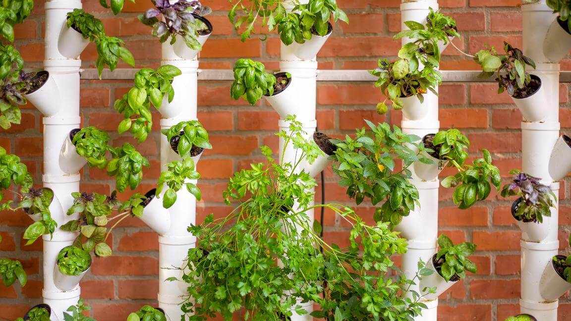 A PVC-cső oszlopokból álló függőleges fűszerkert helytakarékos. Alkalmas sok, kisebb növény elhelyezésére, mint a bazsalikom, a petrezselyem, a snidling vagy bármilyen saláta. A kialakításához 50–110 mm átmérőjű PVC-csövekre, az összekötéshez T-idomokra vagy könyökökre van szükségünk. Ne feledkezzünk el a stabil rögzítőelemekről sem. A talaj megtartásában belső fólia vagy geotextília segíthet. Helyezzük a palántákat a ferdén vágott nyílásokba, ügyelve a talaj megfelelő tömörítésére és a vízelvezetésre.