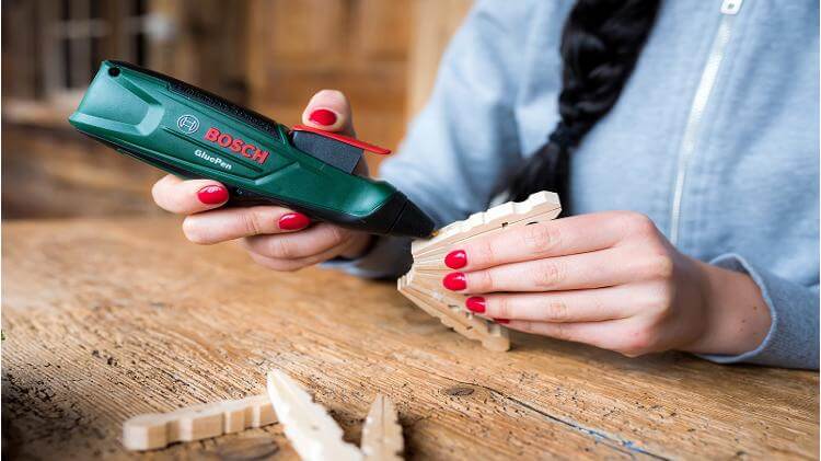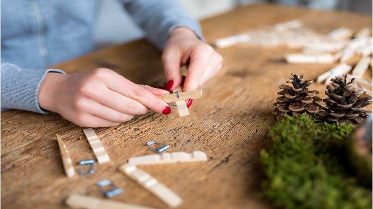 Először távolítsuk el a csipeszekről a fémrugót, majd a szétválasztott darabokat ragasszuk össze ragasztópisztollyal. Ehhez válasszuk a Bosch vezeték nélküli, akkus GluePenjét, mely ideális megoldás bármilyen anyag: papír, textília, fa, fém, műanyag, kő ragasztásához. Győződjünk meg róla, hogy jól összenyomjuk az egyes darabokat, hogy biztosan a helyükön maradjanak. Addig ismételjük, míg kör alakú formát nem kapunk.