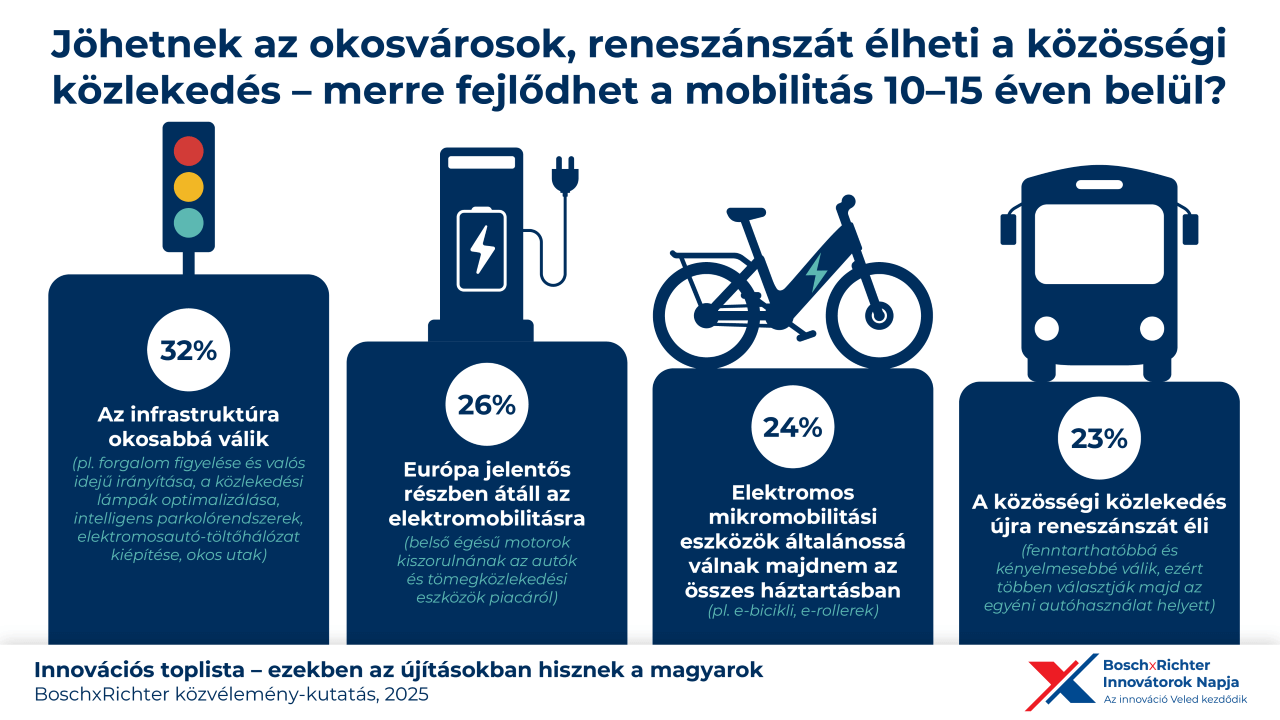 Azért, hogy az okosvárosok koncepcióit egyre közelebb érezzük magunkhoz, azt jól mutatja a magyarországi Bosch csoport és a Richter Gedeon Nyrt. közös innovációs toplistája: Ezekben az újításokban hisznek a magyarok című kutatása, melyet a BoschxRichter Innovátorok Napja konferencián mutattak be 2025 szeptemberében.